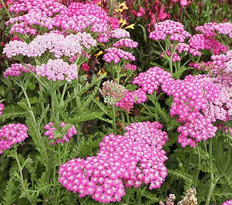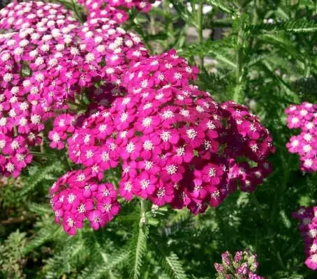 Achillea ‘Cerise Queen’ is a carefree and generously blooming perennial and a pretty addition to any border. From early to midsummer it displays large, flat-topped clusters of vibrant, pink flowers with tiny white centers. The cerise flowers are often darker on the margins and paler at the centre and fade to pale pink as they age. The blooms are borne on slender, sturdy stems which rise from vigorous clumps of dark green feathery foliage.