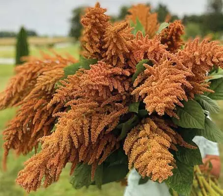 Amaranthus cruentus ‘Bronze’ reaches 90 to 120cm (3½ to 4ft) tall, with very large, handsome dark green foliage and thick stems that need no staking. The branching plumes arise in late summer and continue well into autumn, even catching the first snowfall in some climates. From intense bronze to deep chestnut, the unusual colour shades are great for adding texture to cut arrangements.