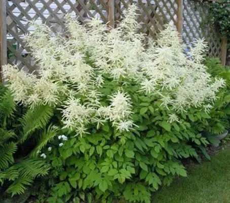 From spring through mid-summer spectacular 50cm (20in) long, arching plumes of tiny, creamy white to greenish white flowers float above the plant. The effect is that of a magnificent white Astilbe. Its wands of creamy white flowers are wonderful when used as cut flowers, fresh or dried.