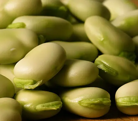 Growing to a height of 90 to 100cm (36 to 40in), the plants are sometimes multi-branching and the leaves are a large lobe shape of a greyish-green. They establish themselves very quickly and produce a very early crop. The white and black flowers appear late spring and are very fragrant. Pollinated by bees and other insects the flowers give way to bright green pods.