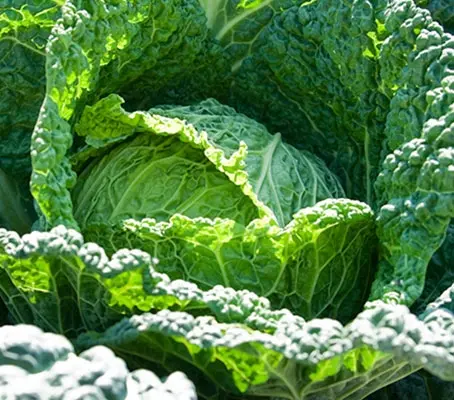 Cabbage ‘Vertus’ produces rounded heads of finely blistered, dark green ruffled leaves that have a sweet, subtle flavour compared to other savoy cabbages.