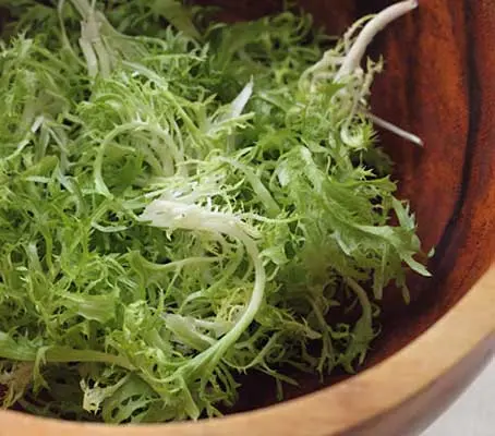Popularised in the 1990s, Frisée often appears in mesclun and other salad mixes, because the green is extremely laborious and expensive to produce as a sole salad ingredient. It is generally served in loose chunks in salad to highlight its exotic feathered appearance and a small amount can go a long way.