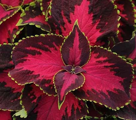 Grown as a flamboyant bedding plant or conservatory houseplant, Coleus (recently renamed Solenostemon) comes in a multitude of forms and colours, with dramatic foliage ranging from bright reds, yellows, greens, bronzes, pinks and browns. This ornamental member of the mint family is native to Indonesia and is therefore tender. Although many species are technically perennials, they are typically grown as annuals.