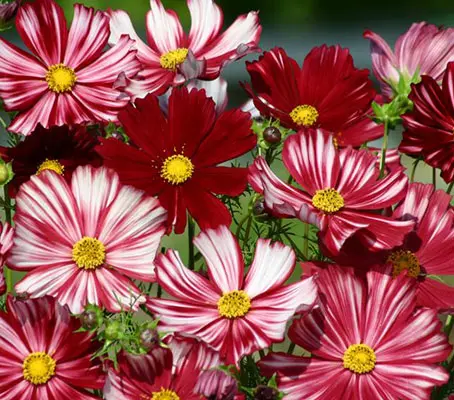 Cosmos bipinnatus ‘Velouette’ is an exceptional Cosmos variety. The large flowers are the same sizzling dark red as Rubenza, but the petals have a unique contrasting colour pattern. Some flowers have clear white stripes, and some are white with a dark red picotee.