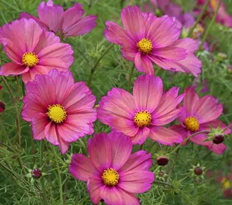 Stake the taller varieties with a single or tripod of canes and some twine. Cosmos foliage is finely-cut into threadlike segments. When flowering, the taller varieties may become top heavy. This problem is alleviated when grown in groups, as the bi-pinnate leaves interlock, and the colony supports itself.