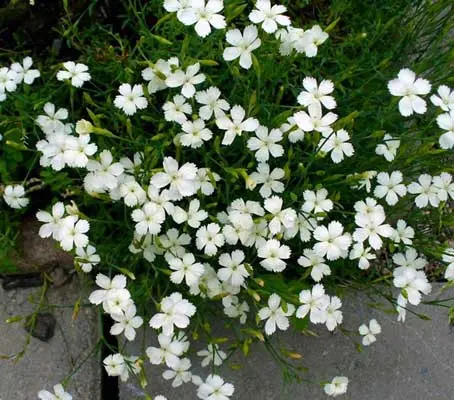 Dianthus deltoides ‘Confetti White’ feature snow white blooms. The flowers appear in abundance, just poking their heads above the deep green foliage. In the early morning dew or after a shower of rain they sparkle like clear white diamonds.