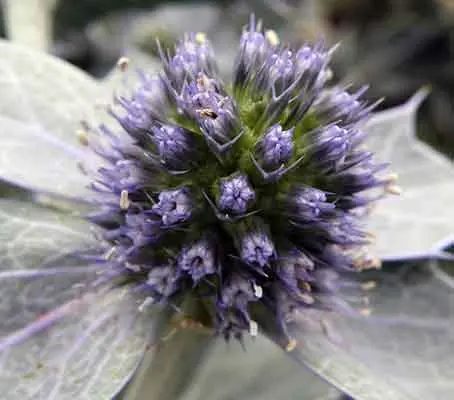 Eryngium maritimum is an evergreen perennial plant native to Europe and often found on sea shores, it is a protected species in many parts of the world. It is a highly ornamental plant often grown in gardens for its metallic bluish flowers and intensely whitish-glaucous leaves.