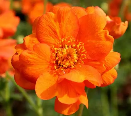 Geum coccineum ‘Borisii-Strain’, often marketed as ‘Tango’, ‘Queen of Orange’ and ‘Cooky’ is an early flowering variety, with single, overlapping, orange-red petals and orange-yellow stamens.