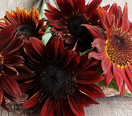 Helianthus annuus ‘Ruby F1’ has a dark centre is surrounded by a dense array of rich deep ruby-red petals that form large 15cm (6in) flowers.