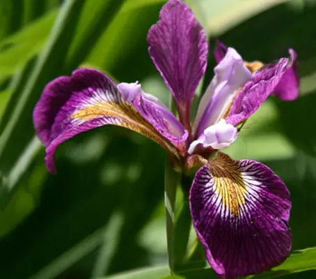 A similar southern wetland species, Iris virginica occurs from Virginia to Florida and Texas, and is called the Southern Blueflag. It is a smaller plant, to 60cm (24in) tall, with bright green leaves that often lie on the ground or water.