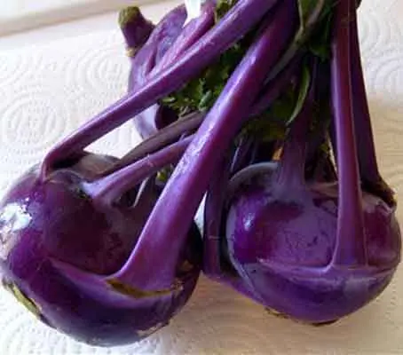 The greenish skin types are called “White Kohlrabi.” Purplish-skinned Kohlrabi is sometimes called “violet”, and other times called “red.” Regardless of skin colour, all types are white inside.