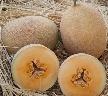 Producing large oval shaped, slightly netted fruits with beige rind and apricot pink to ivory-yellow interior when mature. Underneath the thin rind, the flesh is has a soft but dense consistency, encasing a small cavity of light brown seeds.