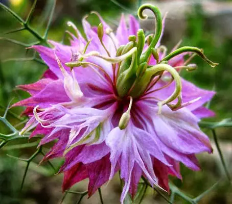 The genus Nigella is native to North Africa and southern Europe. It is one of about twenty species in the genus, all of them annual herbs from the Mediterranean region. Several are cultivated in gardens, and one, Nigella sativa, is grown for its aromatic seeds.