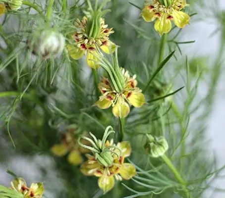 The genus Nigella is native to North Africa and southern Europe. It is one of about twenty species in the genus, all of them annual herbs from the Mediterranean region. Several are cultivated in gardens, and one, Nigella sativa, is grown for its aromatic seeds.