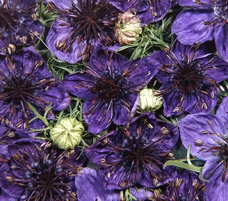 Nigella earns its common name of Love-in-a-Mist from the tangle of ferny, fennel like foliage that forms a mist around the flowers. In addition to their use as a good cut-flower, the foliage makes a good ‘filler’ for any vase. After flowering, the plants produce unusual seed pods that can be used in fresh or dried arrangements.