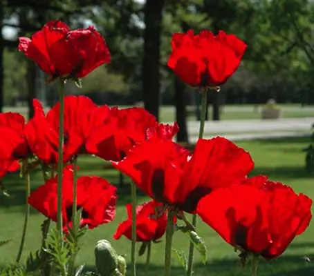 Oriental Poppies are prodigious bloomers. One-year old plants will send up at least three blooming stalks. Older plants produce a dozen or more over a 30 day period. To achieve such immense blooms and intense hues, one would assume that poppies require exact growing conditions. Nothing could be less true. They are happy in most sites and soils though will flower be at their best in full sun in well drained soil. They flourish in spite of drought, baking from intense summer heat or freezing in winter. Once established, the bold Oriental poppies grow and multiply for decades.