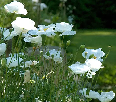 At their best when planted in big drifts, they also make wonderful, if somewhat short-lived cut flowers. The glistening white blooms with silky petals are stunning in their simple purity.