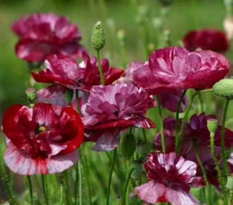 Botanically known as Papaver rhoeas, and commonly referred to as the European corn poppy. The typical red-flowered wild Flanders field poppies, as seen in old paintings and in meadows throughout much of Europe, has been developed into numerous colourways and magical combinations