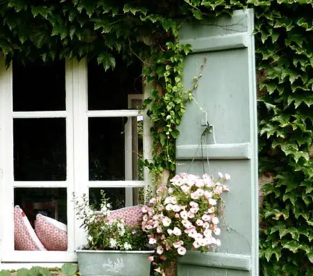 In courtyards and other small garden areas, growing ivy and other vines up the walls extends the garden and helps create a sense of quiet and enclosure.