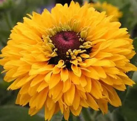 Rudbeckia hirta ‘Maya’ is a fabulous award winning variety of this clump forming short-lived perennial. Throughout the summer, it bears many beautifully doubled golden daisies with petals so dense they almost look like pincushions. Golden yellow, with a kiss in the centre — almost like a Zinnia in appearance.