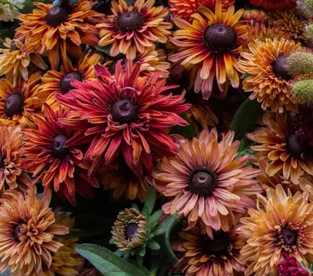 Semi-double and double velvety blooms in subtle shades of pale cappuccino, deep caramel, copper and dusty raspberry and everything in between. Rudbeckia hirta ‘Sahara’ produces the most spectacular blooms in late summer, coming to its peak just as others are starting to fade. These exquisite blooms capture the hues of a summer sunset.