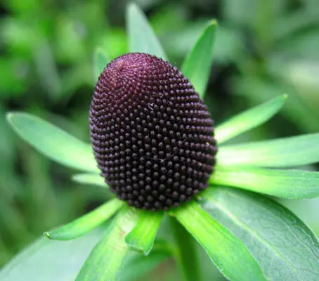 Surrounding the large and impressive central almost black, dome-shaped boss are not the petals of your average, self-respecting flower, but rather ten or so, large, well spaced, stiffish, very petal-like things: strictly involucral bracts (or, if you want to be up-to-date with the correct name, phyllaries) – calling them green flowers seems simplest!