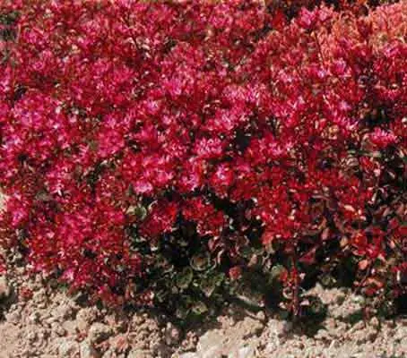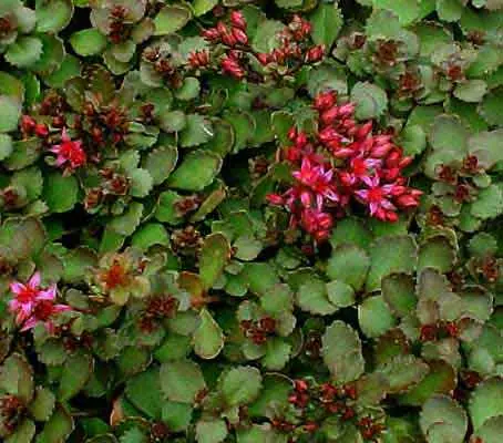 In July, dense clusters of showy crimson blooms smother the evergreen plants. Usually about three to four inches tall, the flower stems raise three or four inches above the leaves. The flowering can be so dense that the leaves are completely hidden.