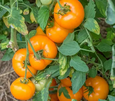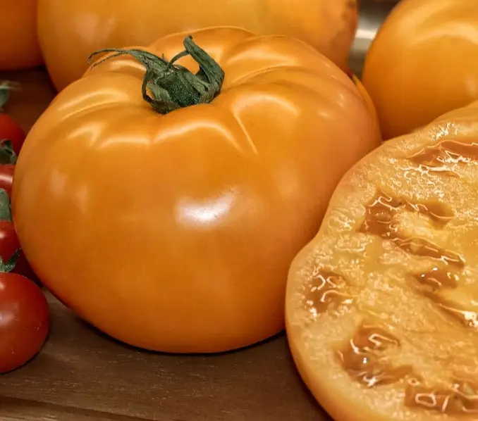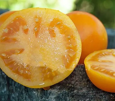 The plants produce medium to large fruit with an average weight of around 175 grams, a large salad or small beefsteak type of tomato that is sometimes slightly flattened. Golden, deep honey coloured, the flesh is soft and fleshy, with a sweet and intense flavour. The fruits can be used for canning but are at their absolute best when eaten fresh as a snack or used as a splash of colour in a salad.