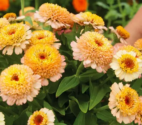 A breakthrough in Zinnia breeding ‘Zinderella’ produces large flowered, semi-double and fully double blossoms that are layered thickly with a stunning crown and contrasting dark centres. The cream-apricot and peach crested blooms have salmon pink undertones, each with a distinct dark eye.